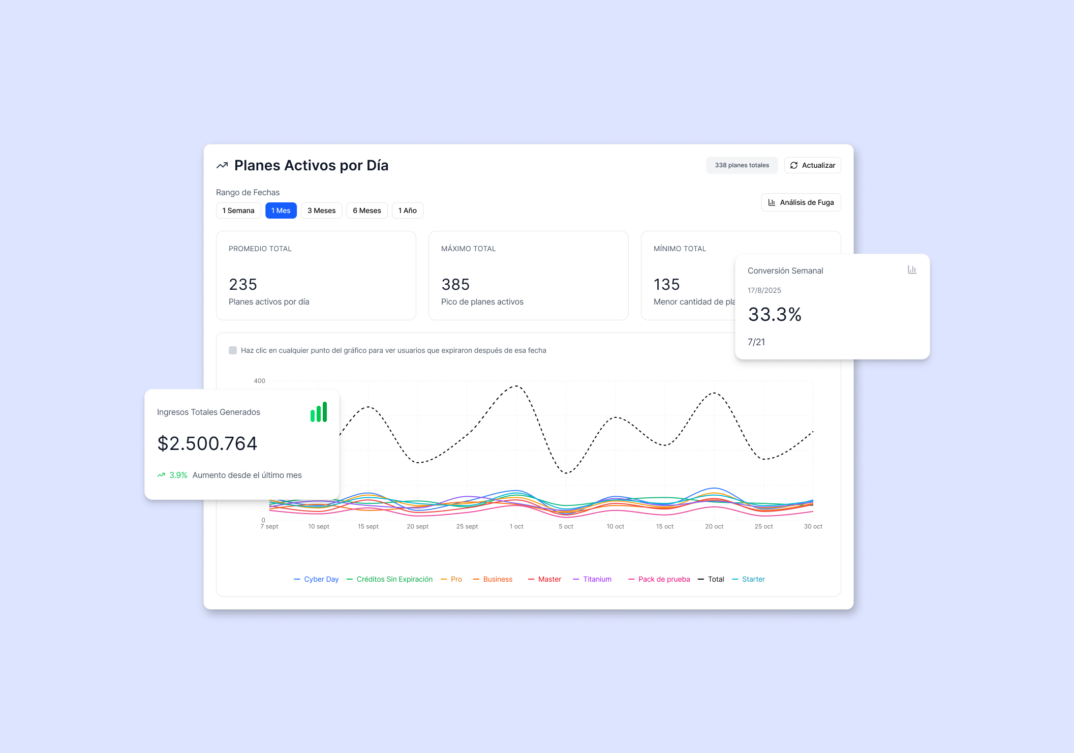 Crea planes a la medida de tu negocio, ya sea planes de prueba, por temporalidad o aplicar descuentos por volumen de sesiones, cualquier opción que se te ocurra es posible.